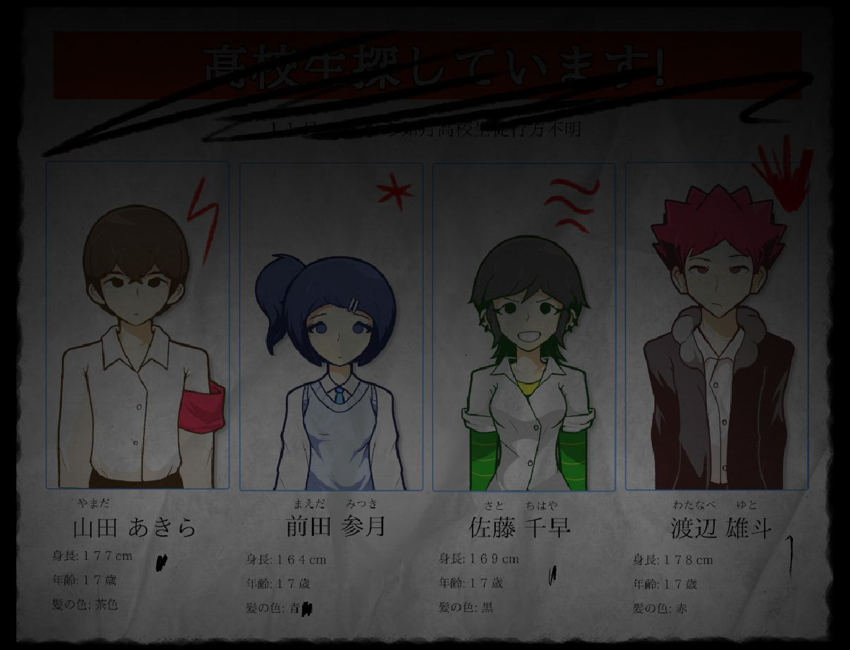 The students were last seen on September 23, 2005, at approximately 12:46 P.M., as the lunch period began. According to eyewitnesses, Chihaya Sato was observed entering the room alongside Yuto Watanabe at 1:12 P.M., followed shortly after by Akira Yamada and Mitsuki Maeda, who arrived at 1:16 P.M.